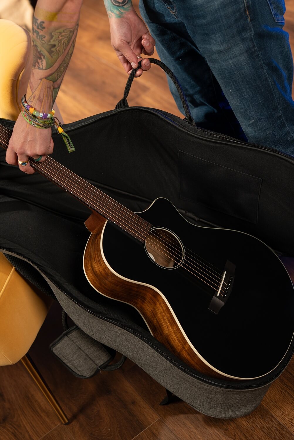 While the Gold‑MC6 focuses on torrefied response and premium appointments, the Core‑MC Ovangkol brings a different sonic flavor and a modern aesthetic to the lineup. Core‑MC Ovangkol is designed for players seeking an all-solid wood instrument that blends contemporary aesthetics with refined acoustic performance, the Core-MC Ovangkol pairs a solid cedar top with solid ovangkol back and sides, modern concert body styling, and onboard Fishman® electronics. With its semi-gloss black top and player-focused construction, the model delivers responsive tone, stage-ready functionality, and detailed craftsmanship built for long-term performance.
